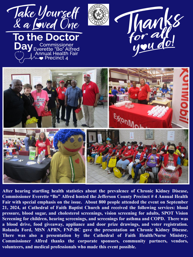 On September 21, 2004, Jefferson County Precinct # 4 collaborated with the U.S. Department of Health & Human Services, The Tom Joyner Foundation, and "Take a Loved One to the Doctor Day" Campaign in support of "Closing the Health Gap Campaign". The 9th Annual Health Fair was held at two locations, Boyt Service Center and Mae Jones-Clark Elementary School. This national event focuses on encouraging individuals to visit with health professionals, attend the event in their community, or assist a neighbor, friend or family member to visit a health professional. Approximately 520 individuals attended the Health Fairs this year. The fairs provided free services such as blood pressure, diabetes and cholesterol screenings, eye screenings and reading glasses, hearing screenings, as well as Body Mass Index (BMI), doctor examinations, and much more. LifeShare Blood Centers also hosted a Sickle Cell Blood Drive during one of the events. Special guest were Foster Grandparents who also volunteer and participated with Physical Examinations.